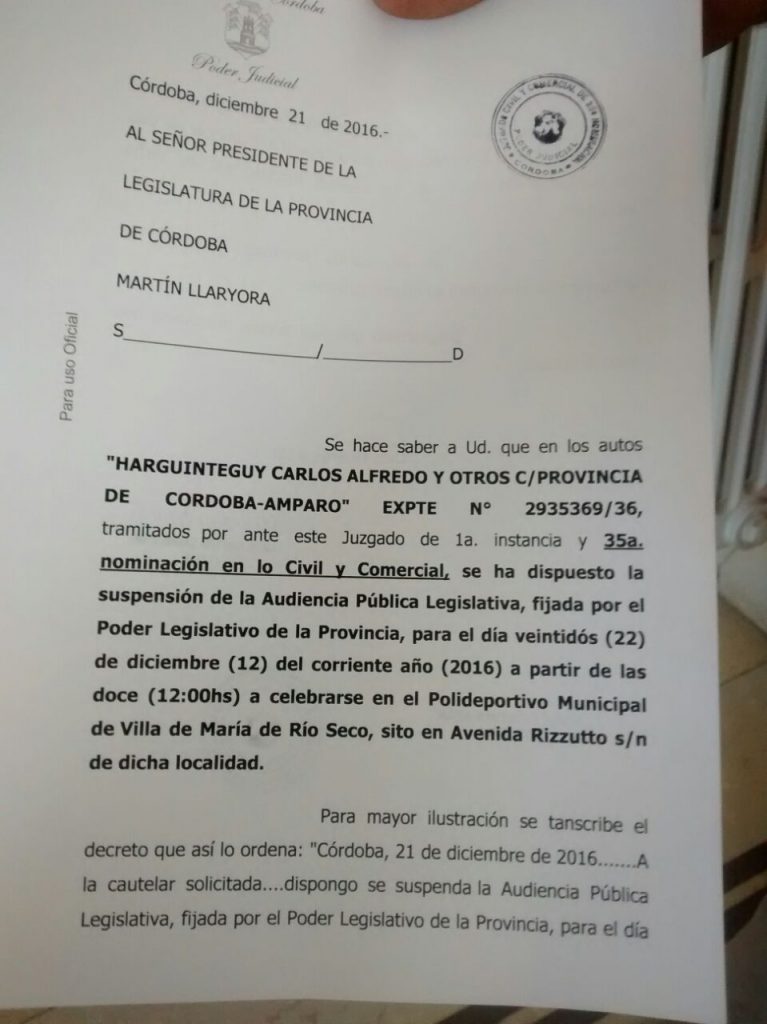 La Jueza Sammartino hizo lugar a la medida cautelar que suspende la convocatoria a Audiencia publica legislativa para el día 22 de diciembre a las 12 en Villa de María de Rio Seco. Hablamos con Dario Avila, abogado que viene acompañando las luchas socioambientales de Córdoba y el país desde la parte legal en cuanto […]