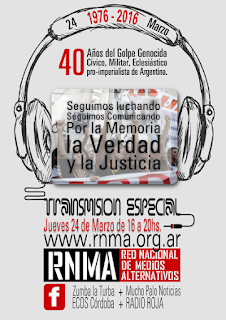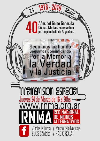 A partir de las 16 hasta las 20 horas, otra vez saldremos al aire y a las calles para visibilizar la lucha por la Memoria, la Verdad y la Justicia en todo el país. El programa especial será transmitido en vivo por Radio Zumba La Turba, Radio Roja, Mucho Palo Noticias y ECOS Córdoba a través de www.rnma.org.ar.